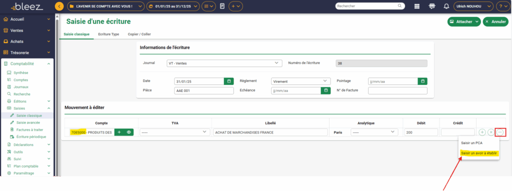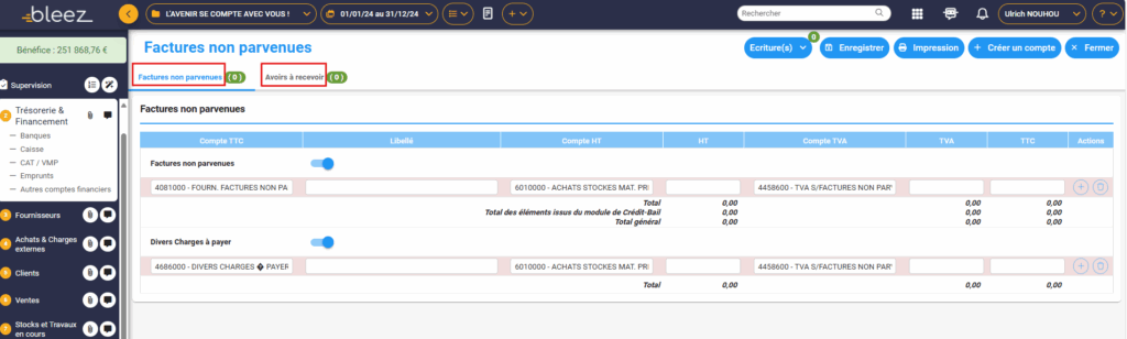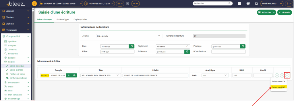 Une fois sur l’assistant, vous pouvez aussi saisir vos FNP / AAE (libellé, compte, montant HT et TVA).